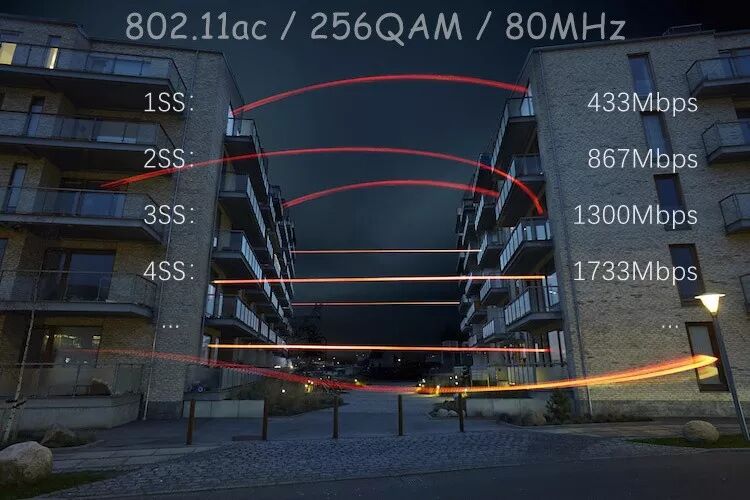 尽管11ac理论上支持8条空间流,但在家用WiFi市场基本只做到4×4(80MHz)或2×2(160MHz),即理论带宽为1733Mbps,距离11ac极限带宽(6.9Gbps)差很大,但仍足以将WiFi带宽提升到千兆,与家用有线网络平级。