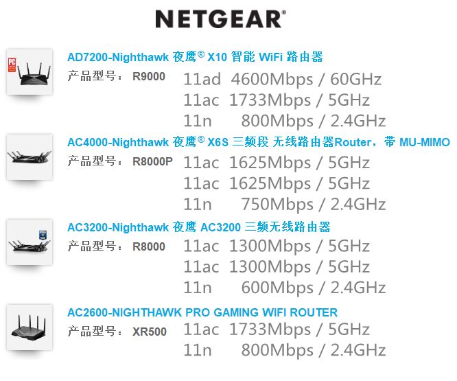 同理,隔壁网件家的无线路由也是这么标定,旗舰款R9000是AD7200规格,即AD4600+AC1733+N800,再向上取整。