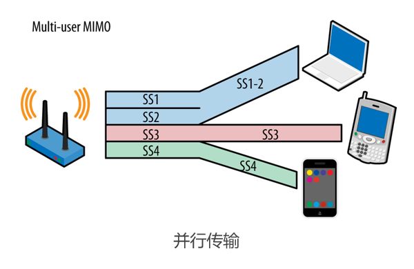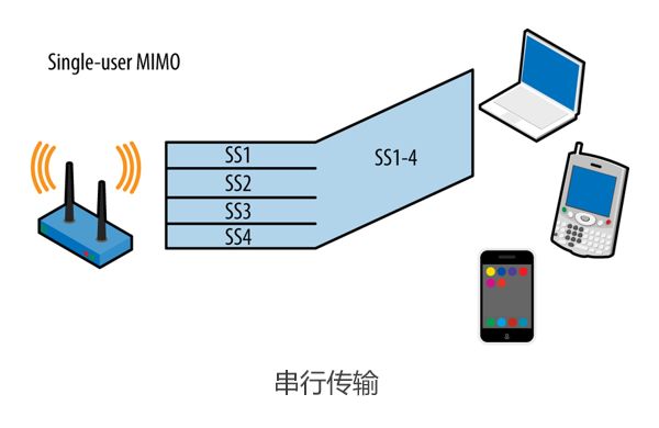 严格来说,原有的MIMO也叫SU-MIMO(即单用户MIMO),虽然它支持多天线同步传输,但在同一信道&同一时刻,无线路由器只能与一个终端通信,即串行传输。
