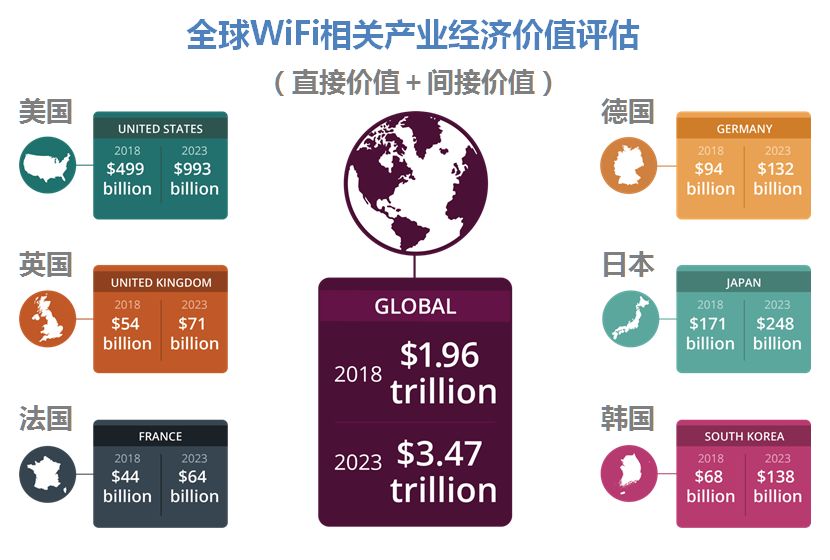 至少Wi-Fi联盟还是乐观的,根据他家最新调研报告预测,2018年度全球WiFi相关产业的(直接与间接)经济价值高达2万亿美元,到2023年更有望增长至3.5万亿美元!其中,美英法德日韩是全球WiFi最发达(财)的国家。