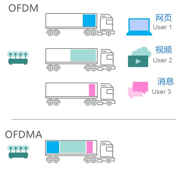 用卡车拉货来解释更直观,OFDM方案是按订单发车,不管货物多少,来一单发一趟,哪怕车厢空荡荡;OFDMA方案会将多个订单聚合起来,尽量让卡车满载上路,使得运输效率大大提升。