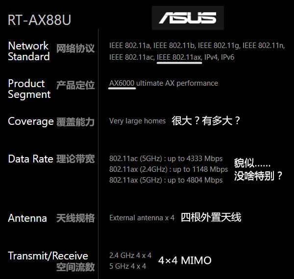 咳咳,先来看看华硕次世代无线路由的WiFi规格,参数信息还算直观清晰,简单说RT-AX88U是一款AX6000无线路由器,支持4空间流,11ax协议下2.4G理论带宽1148Mbps、5G理论带宽4804Mbps,两个数值累加为5952,向上取整即6000,因此叫AX6000。