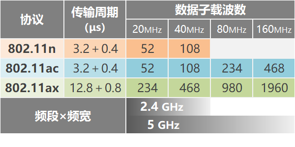 无线电波在信道内以帧的形式传输,每一帧又由若干子载波组成,子载波的数量直接反映传输带宽的高低。以11n/ac为例,20MHz信道支持64个子载波,扣掉抗扰子载波与导频子载波后,实际用于数据传输的子载波为52个,而40MHz信道的数据子载波为108个,是前者的2.08倍(并非工整的两倍)。