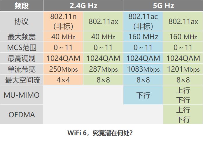 2.4G频段:非标11n单流带宽也能跑到250Mbps,与11ax的287Mbps没差多少,短期内WiFi终端最高就4条空间流,根本拉不开差距。