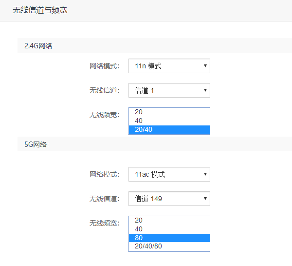 诚然,频宽越大,单帧发送的数据子载波就越多,WiFi速率就越高,但仍离不开鱼与熊掌的问题。频宽越大,WiFi信号质量越差,覆盖能力越弱,兼容性也不理想。所以,通常无线路由器或AP上都有频宽设置选项,由用户根据终端与应用情况自行取舍。