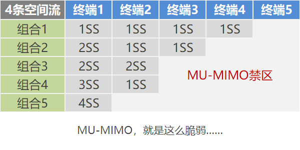 然而,MU-MIMO并不完美,它的运行状态不够稳定,很容易受终端影响。还是之前的例子,4条空间流只能满足合计4SS的终端完美跑MU-MIMO,基本就是下面这五种组合,顶多支持四台终端。一旦终端数量超过4台,就要排队;一旦合计负载超过4SS,就要降速。