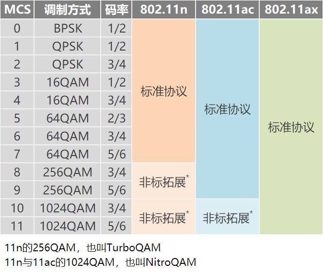 WiFi设备的理论带宽不工整,是缘于单流带宽本身就不工整,简单归纳一下,近三代标准在不同调制&频宽情况下的单流带宽是这样滴,基本乘上个二三四,就是你所熟悉的理论带宽。