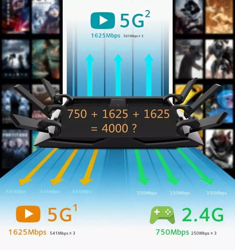 以本期主角网件R8000P为例,其标称的AC4000只是三个独立频段的带宽累加值,即2.4GHz的750Mbps + 5GHz(1路)的1625Mbps + 5GHz(2路)的1625Mbps,但是不管你的终端有多强,它只能工作在其中一个频段下面,并不能同时连接双频或三频来实现并发传输。