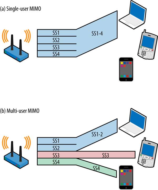 MU-MIMO即多用户MIMO,它是在SU-MIMO的基础上,增加多终端同步传输的机制,从而提高路由器理论带宽的利用率。还是之前的例子,在支持MU-MIMO的情况下,4×4的路由器恰好可以同时与三台终端通信,而且三台终端都不会降速,路由器的带宽得以充分利用。下图就是两种MIMO最直观的体现: