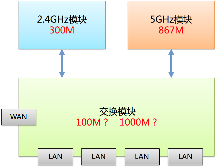 还是看图更直观,对于AC1200无线路由而言,2.4G模块理论带宽为300M,5G模块理论带宽为867M,它们好比是公路入口的宽度,而交换模块的带宽才是公路主道的宽度。那么问题来了……如果主道只有100M,那么再宽的路口也快不起来。