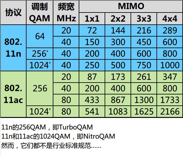 2、调制方式:很深奥的概念,简单说就无线信号的数据包密度,在频宽相同的情况下,QAM数值越大,MIMO单流的理论带宽越高。802.11n标准的调制方式为64QAM,在频宽40MHz时单流带宽为150Mbps;802.11ac则将标准提升至256QAM,同频宽下单流带宽就变成200Mbps。有意思的是,某些芯片厂家(博通、高通)将11ac的256QAM移植到11n协议里,从而将11n的单流带宽从150Mbps提升至200Mbps,这就是所谓的TurboQAM。更有甚至,这些军火商又将11n和11ac的256QAM进一步提升至1024QAM,即所谓的NitroQAM。尽管从理论带宽上看,TurboQAM和NitroQAM都让单流速率芝麻开花,不过它们并非802.11的标准规范,纯属芯片厂家的创新行为,因此其加速效果完全取决于终端的兼容性。