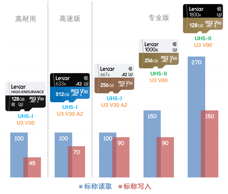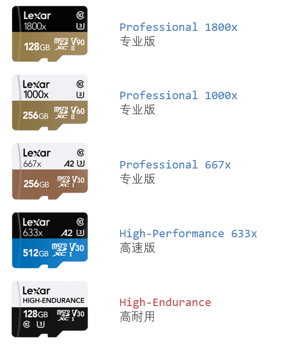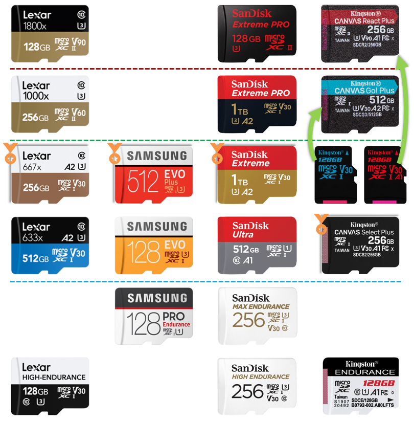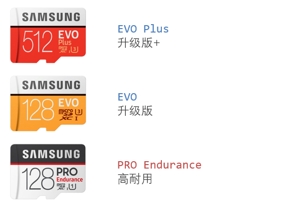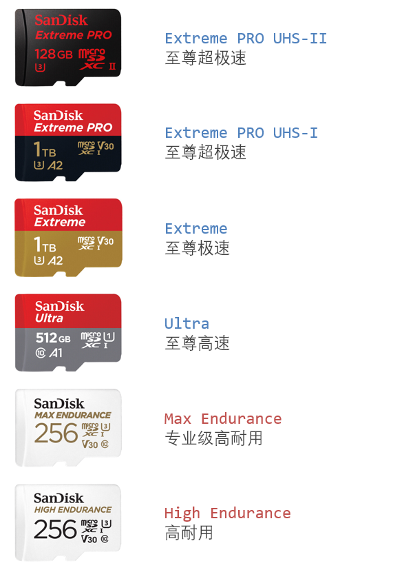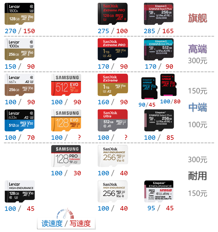 上面三类为常规TF卡,涵盖旗舰、高端与中端,这里不谈低端卡,最下面一类为高耐用TF卡,挂勋章的为性价比甜点。