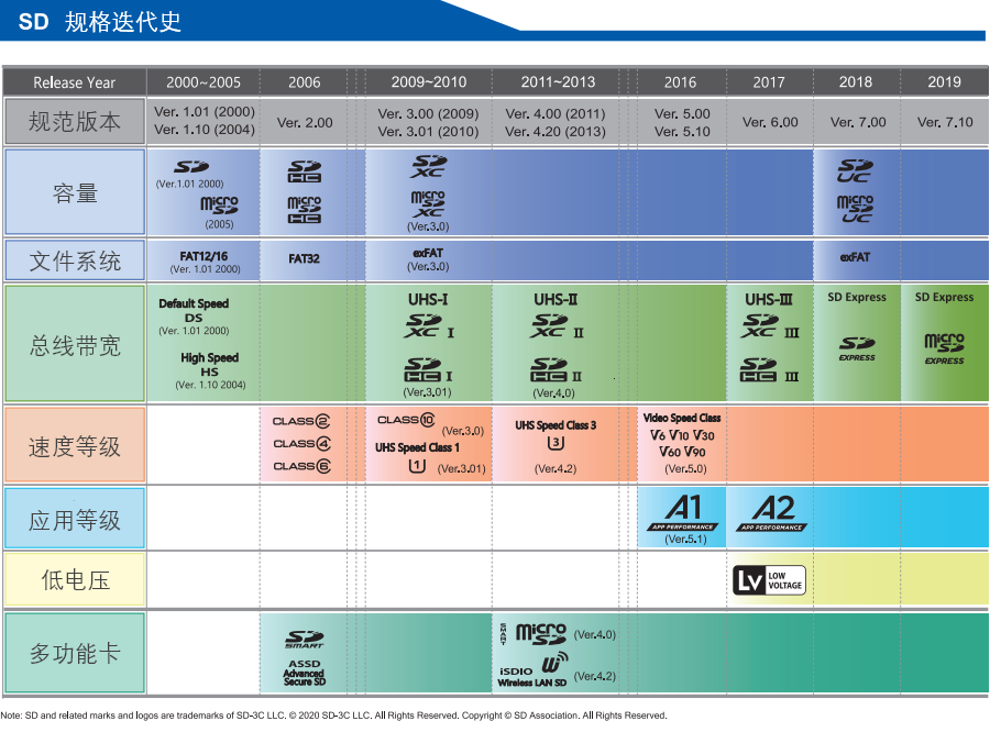 尽管从形态上,2000年发布的SD卡与2005年发布的microSD卡沿用至今,但它们内在的技术规格,却从未停止进化。截至2019年,SD标准规范已更新至V7.10版本,下面就来简单回顾。