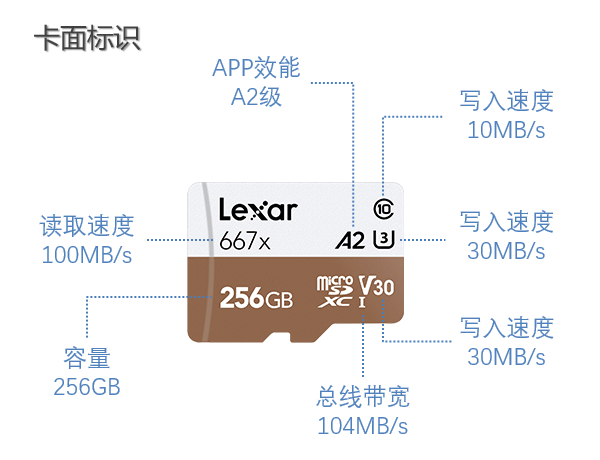 • 667x为雷克沙特有标识(非SDA规范),代表标称读取速度近似值,侧面反映存储卡档次,667x即150KB/s*667=97.7MB/s,实际官方标称读取速度为100MB/s。