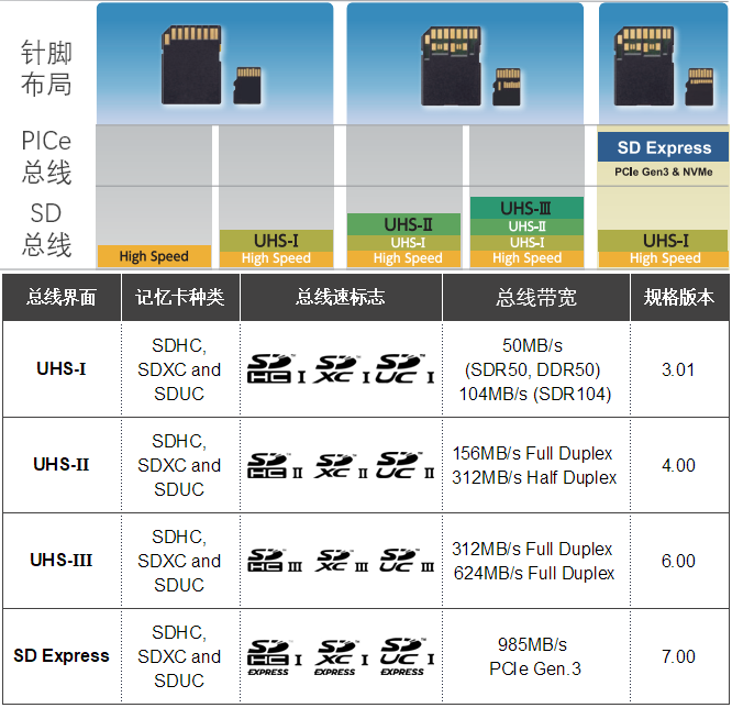 2018年(V7.00):推出SDUC标准,容量上限提升至128TB,同时推出吊炸天的SD Express总线,带宽提升至985MB/s。