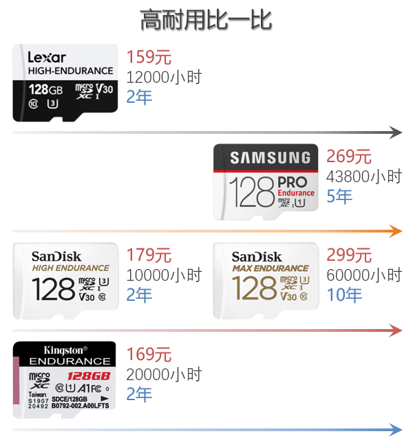 最后,盘一盘四大品牌的高耐用TF卡,考虑到耐用性与容量相关,这里统一选取128GB,综合对比售价、耐用性与质保期。