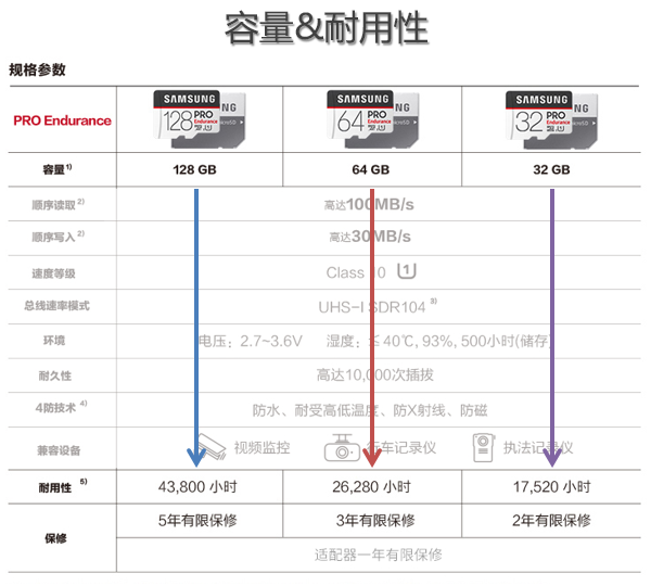 其次,高耐用TF卡的核心规格不是读写性能,而是耐用性(即连续录制时间)。值得注意的是,耐用性也与容量相关,容量越大寿命越长。