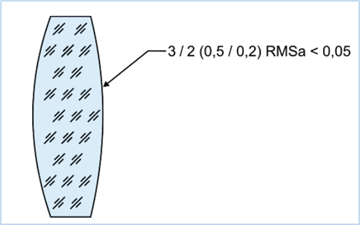 在上图的面形公差中,允许最大的矢高误差是2个条纹间隔,表面不规则不超过0.5个条纹间隔,其中旋转对称性不规则不超过0.2个条纹检测,不对称RMS不大于0.05个条纹间隔。