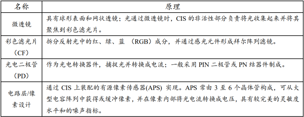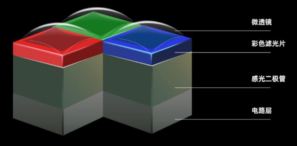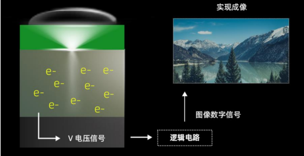 光通过具有球形表面的微透镜后聚拢穿过彩色滤光片,拆分成为红、蓝、绿色光进入感光二极管内并转化为电子,再经由像素电路转化为电压信号,最后通过逻辑电路输出成为图像数字信号。