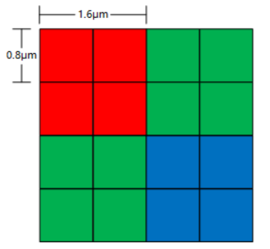 像素,即亮光或暗光条件下的像素点数量,是数码显示的基本单位,其实质是一个抽象 的取样,我们用彩色方块来表示。图示像素用R(红)G(绿)B(蓝)三原色填充,每个小像素块的长度指的是像素尺寸, 图示尺寸为0.8μm。