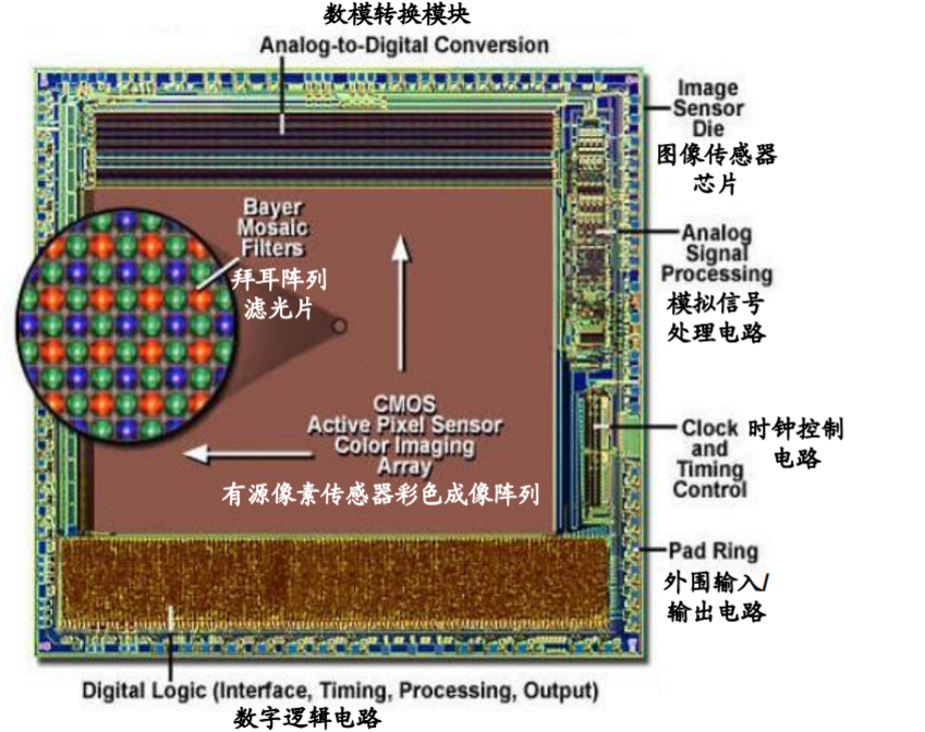 CMOS 图像传感器是模拟电路和数字电路的集成。主要由四个组件构成:微透镜、彩色滤光片(CF)、感光二极管(PD)、电路层。
