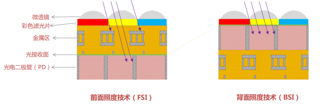 技术改进后,在背面照度技术BSI(FRONT-SIDE ILLUMINATED)的结构下,金属(铝,铜)区转移到光电二极管(PD)的背面,意味着经拜尔阵列滤镜收集的光线不再众多金属连线阻挡,光线得以直接进入光电二极管;BSI不仅可大幅度提高信噪比,且可配合更复杂、更大规模电路来提升传感器读取速度。
