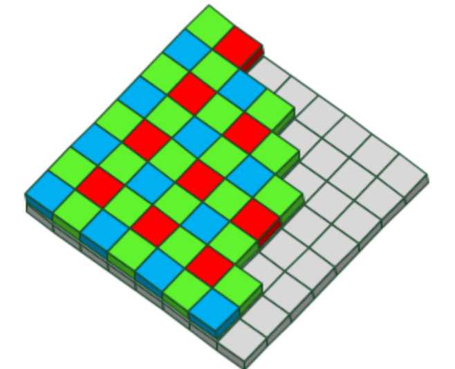 感光元件上的每个方块代表一个像素块,上方附着一层彩色滤光片(CF),CF拆分完反射光中的 RGB成分后,通过感光元件形成拜尔阵列滤镜。经典的Bayer阵列是以2×2共四格分散RGB的方式成像, Quad Bayer阵列扩大到了4×4,并且以2×2的方式将RGB相邻排列。