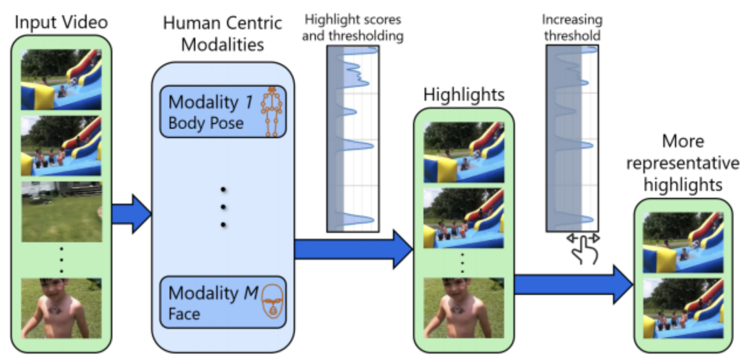 - 使用以人为中心的模式的高亮检测。我们的方法在每个输入视频中识别可观察到的模式,如姿态和面孔,并将它们在时间和不同人的相互关系编码为高亮分数,用于高亮检测。