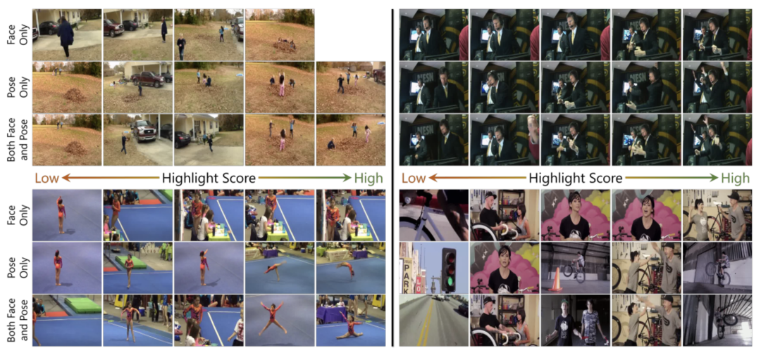 图5:通过我们的方法检测到的高亮显示示例帧。我们展示了使用我们方法不同消融版本检测到的高亮分数范围内的样本视频帧。我们展示了来自数据集SumMe[15](左上)、PHD2[11](右上)、DSH[47](左下)和TVSum[46](右下)的一个示例视频。当只使用面孔或姿势时,我们的方法只基于面部或姿势的代表性来学习高亮分数。结合这两种模式,我们的方法学习基于代表性的突出分数。