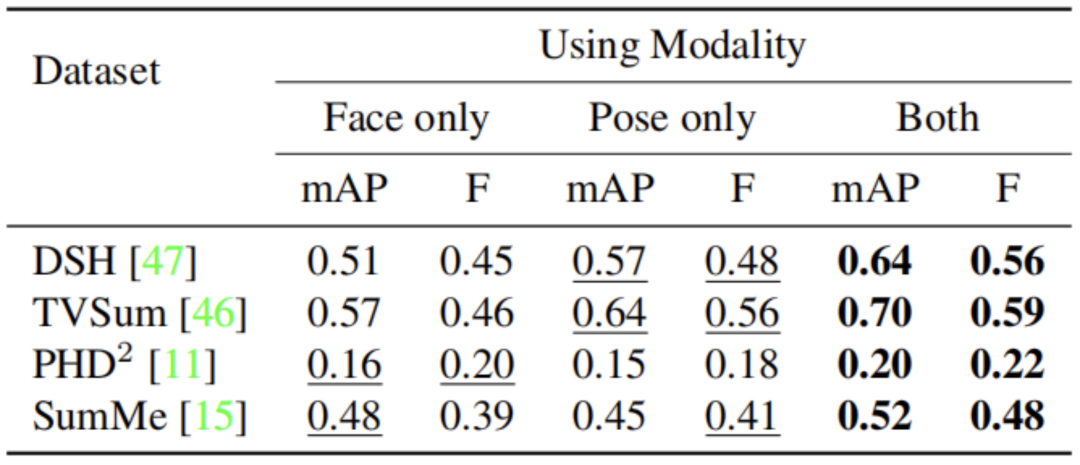 我们还在图5中展示了我们的方法及其所有消融版本在DSH、PHD2、TVSum和SuMMe四个数据集中的一个样本视频的定性性能结果。我们可以看到,当只观察姿势而不是面孔时,我们的方法无法检测到主要有面部表情和情绪的代表性摘录。相反,当只观察面孔而不是姿势时,我们的方法只能检测面孔突出的摘录,而忽略面孔太小、太遮挡或在黑暗中的摘录。使用这两种模式,我们的方法可以检测到所有有代表性的摘录。