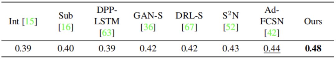 在SumMe数据集上,我们再次比较了Gygli等人[15] 基于兴趣度总结的(Int.)自适应FCSN(Ad-FCSN)[42]、Gygli等人[16]基于子模块化的总结方法(Sub.)、Zhang等人[63]采用行列式点过程(DPP-LSTM)的LSTM网络、基于 GAN 和额外监督 (GAN-S)的方法[35],Zhou 等人基于深度强化学习的具有额外监督的方法(DRL-S) [67]以及使用编码器-解码器体系结构从序列数据中检测具有高度相关性片段的检测方法(S2N)[52]。