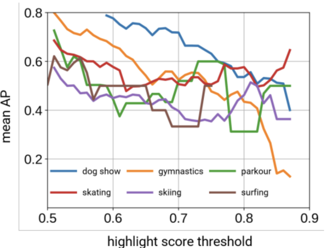 在我们的方法中,我们使用高亮分数的阈值来检测高于该阈值的高光摘录。我们在图4中显示了我们的阈值对DSH数据集中[47]中每个域的平均精度(mAP)的影响。我们观察到,随着我们对阈值的增加,mAP的总体趋势逐渐下降,因为我们的方法返回的高光点越来越少。但是,对于某些领域(例如冲浪)而言,情况并非如此,因为其中代表性摘录的高亮分数已经足够高。在实践中,我们考虑阈值的选择取决于用户的偏好,因此我们建议将它作为可供用户为每个视频配置的参数。