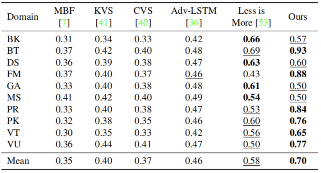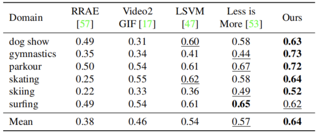 表4:SumMe数据集[15]上的F分数。粗体:最好,下划线:第二好。