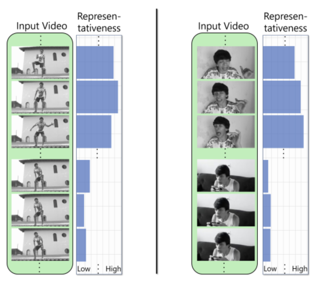 。我们注意到方程的一个平凡的解。1 是选择一个阈值 0≤τ≤T,然后从 Xm 中最具代表性的顶级 τ 的高亮分数为 1,对所有其他帧的高亮分数为 0。然而,选择 τ 并不简单,在实践中需要从数据中学习。因此,我们训练了一个基于自动编码器的深度神经网络来学习广泛数据的高亮分数。我们还允许高亮分数在[0,1]中是连续的,以保持我们的网络的可微性。此外,使高亮分数连续也有助于我们理解每一帧的相对代表性,这是现代高亮检测系统[53,42]的一个内置组件。