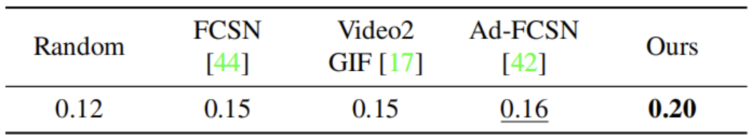 SumMe[15]。我们在表4中报告了整个数据集的平均F分数。按照之前的方法[52,42],我们随机选择20%的数据集来计算平均F分数,重复这个实验5次,并报告平均性能。基于这些实验,我们比表现最好的基线方法高出4%的绝对值。这些结果表明,我们使用以人为中心的模式来检测高亮的方法在所有基准数据集上表现出了最先进的性能。