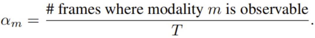 我们还考虑了每个模态m的加权贡献,这样权重就与输入视频中模态可见的帧数成正比。如果该模态的一半以上的组成点在帧中可见,那么我们定义一个模态在帧中是可观察到的。根据这个定义,我们为每个模态m构造一个权值