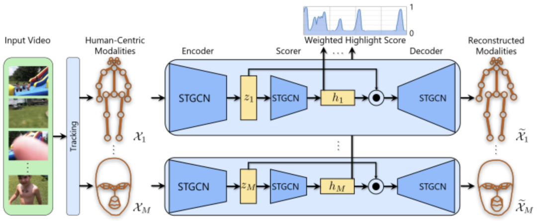 我们的自动编码器架构由一个编码器、一个得分器和一个解码器组成。我们的编码器从一个输入视频中获取每个可观察模态m的时空图表示。它使用一个单独的时空图卷积网络(STGCN)[56,28,9]将每个模态m的