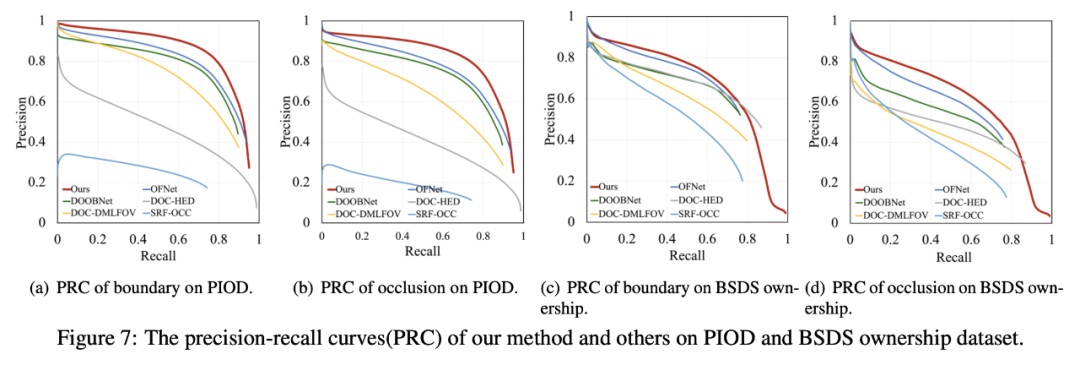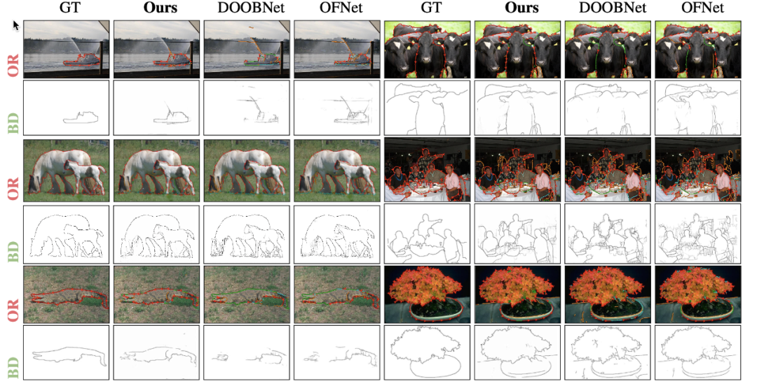 其中,OPNet + dor/dbr 为在作者网络上使用 DOC 方向 loss 或 DOOBNet 方向 loss 的结果。通过比较 OPNet + dor/dbr 和之前方法的结果,可以证明作者的网络在遮挡关系推理中明显优于先前的网络结构。在使用了作者提出的 OOR 作为方向预测的方式后,结果相比于之前最优的方法 OFNet 在 AP 上甚至有 6.5%/10% 的提升。并且在与单独训练边界和方向任务的比较中,最终在同一网络中联合训练两子任务的方式获得了更优的结果,这也证明了作者设计的 OPDecoder 可以使两任务相互促进,更好地联合学习、预测。