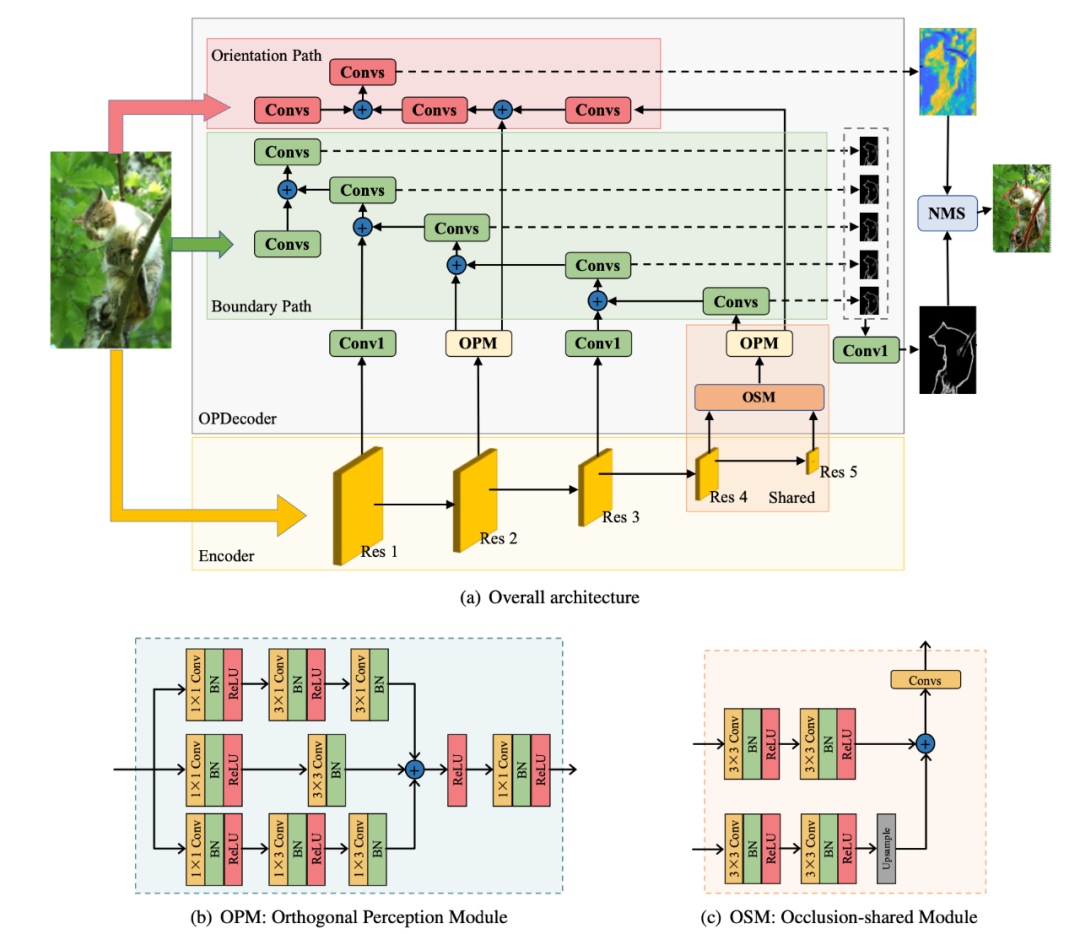如图所示,解码器包含一个深遮挡共享阶段和一个浅空间信息分支阶段。在遮挡共享阶段,作者使用 OSM 对两个最深阶段的特征进行解码和聚合,然后将它们传递给后续的边界路径和方向路径。在浅分支阶段,考虑到两个任务之间可能的干扰,作者使用 OPM 来增强来自编码器浅层的特征,然后这些特征将被传送到边界和方向两条路径。