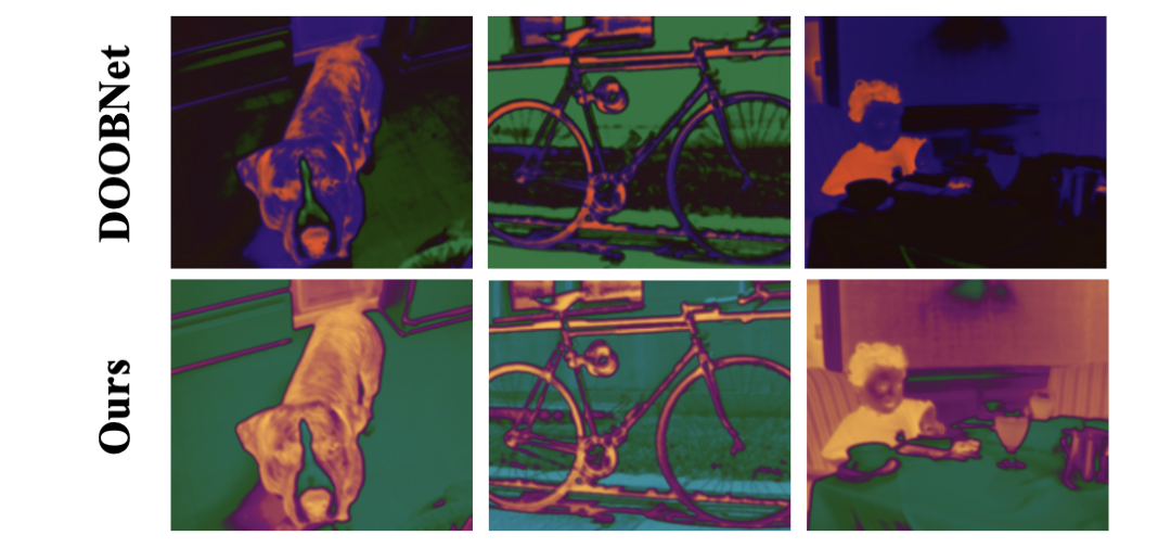 下图是使用不同遮挡方向预测方式的取出的 decoder 阶段的特征图的可视化表示。网络都采用了本文的 OPNet,第一行使用了 DOOBNet 预测遮挡方向的方法,第二行使用了本文提出的 OOR。很明显,本文提出的 OOR 进行表示和预测遮挡方向的方式产生了前后景区分强烈的特征度,或者说使网络学习到了更好的遮挡信息。