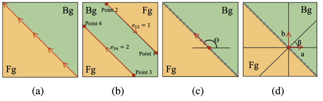 图 (c) 是 DOC 中提出的像素级方向变量表示,它通过预测一个连续的在 $(-pi,pi]$ 的方向变量来预测边界方向图像中的每个像素。像素级方向变量表示可以很好地适应预测属性密集的卷积块,但是依旧存在两个问题,一是这种方式对每个像素都预测了一个准确的角度,造成了不必要的负担,二是角度本身存在周期性,DOOBNet 强制将预测角度的范围限制在 $(-pi,pi]$,会在区间的两端产生不自然的预测,从而导致大量的端点值错误。