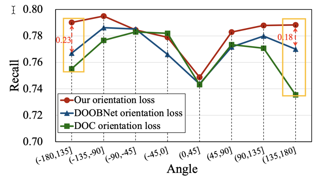 为了证明 OOR 对于角度区间 $(-pi,pi]$ 端点值预测的优化,作者分别对三种遮挡方向预测方式的预测结果进行了分角度区间的遮挡方向预测召回率的比较。从下图可以看到,相比于之前最好的 DOOBNet 的遮挡方向预测,本文的方法在两端分别提升了 0.23 和 0.18。这证明了之前采用区间预测方式存在严重的端点值错误的问题,而本文的 OOR 有效地解决了这一问题。