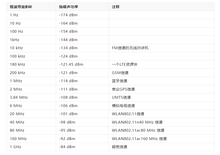 如果信号带宽为1Hz的话,那么-174dBm,就是噪底了。如果信号带宽越宽的话,这个噪底被抬升的越高。