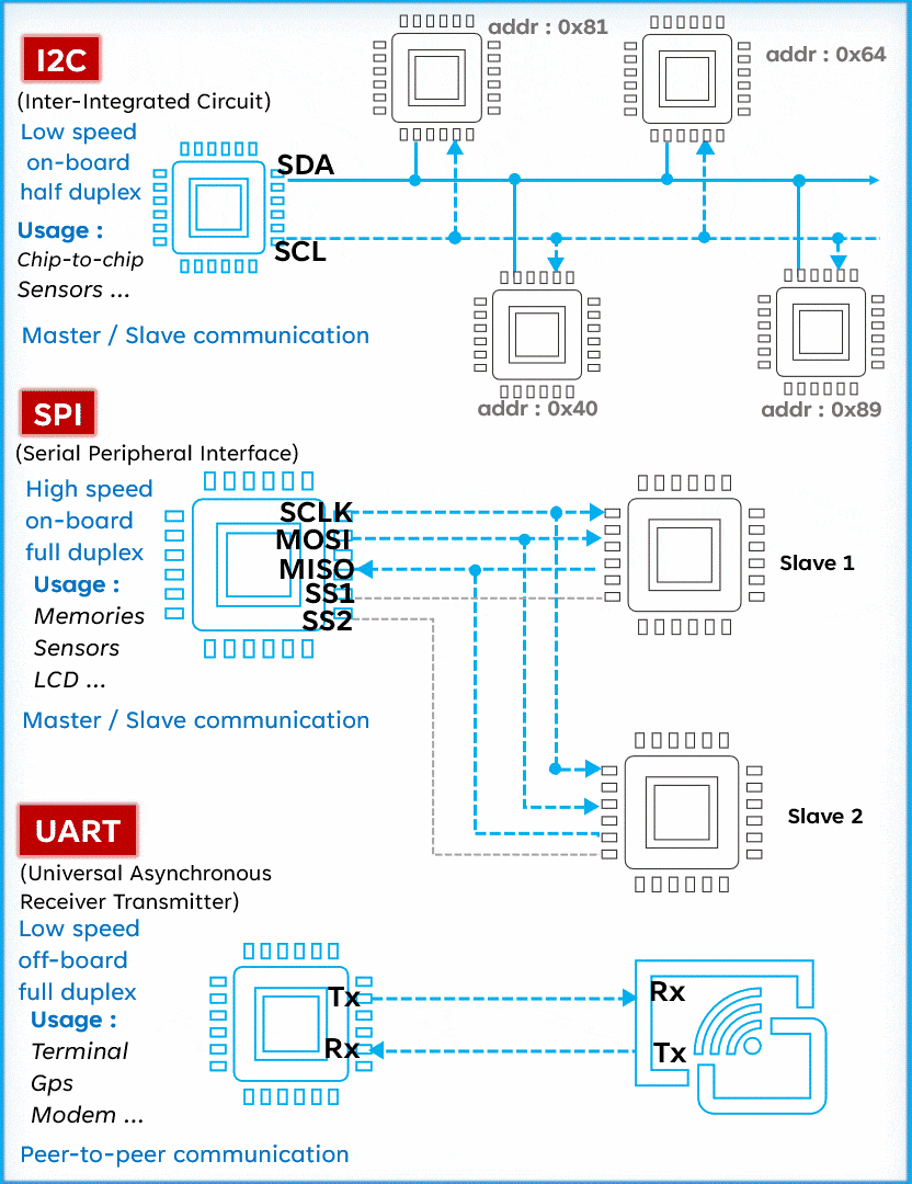 通信速度:SPI 提供高速度,UART 提供高灵活性,I2C 适用于速度要求较低接线简单的配置。 -