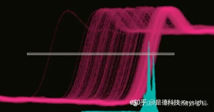 图2中绿色迹线上的红色“x”游标表示信号有抖动时发生的时序误差。请注意,在某些情况下,上升沿或下降边会出现得太快或太晚。这可以在使用余辉显示模式的示波器上看到(见图 3)。如果上升沿出现得太晚,那么接收机会错误解释该比特。边沿交叉点实际发生的时间与理想情况下应发生的时间之差称为时间间隔误差(TIE)。