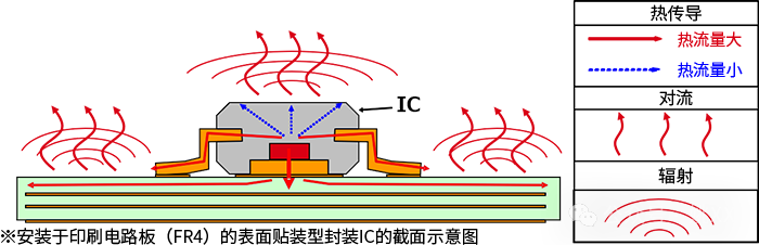产生的热量通过传导、对流和辐射的方式经由各种路径逸出到大气中。由于我们的主题是“半导体元器件的热设计”,因此在这里将以安装在印刷电路板上的IC为例进行说明。