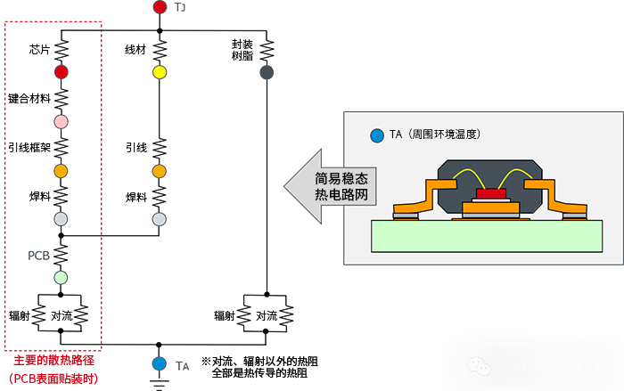 上图右上方的IC截面图中,每个部分的颜色与电路网圆圈的颜色相匹配(例如芯片为红色)。芯片温度TJ通过电路网中所示的热阻达到环境温度TA。