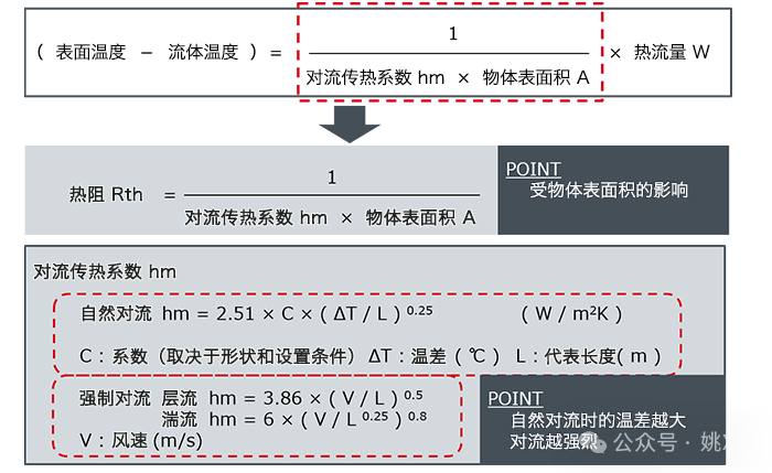对流中的热阻是对流传热系数hm与发热物体的表面积A乘积的倒数。从公式中可以看出,对流换热热阻随着物体表面积的增加而减小。