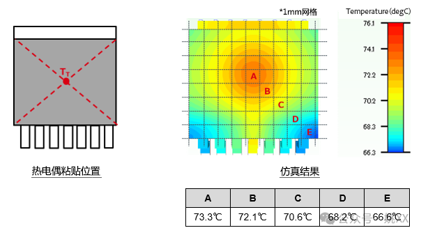 TT的定义为“封装顶部中心的温度”,因此热电偶的安装位置确定为封装顶部中心,需要将热电偶的测量端(连接端)正好安装在那个位置。如果实际安装位置不同,TT值就会发生变化。下图是对封装表面的温度分布进行仿真的结果。由于封装密封树脂的热导率为0.3~1W/mk左右,因此即使是毫米级的偏差,也会造成温度差异。下面的表格中列出了图像上A~E点的温度。