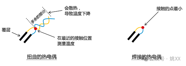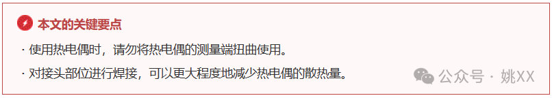 热电偶是通过使两种不同类型的金属线接触,来发挥温度传感器的作用。偶尔可以看到将导线扭在一起,在使之相互接触的状态下使用的情况。虽然这种状态也可以测量温度,但要想更准确地测量温度,还是需要焊接测量端,这是基本要求。